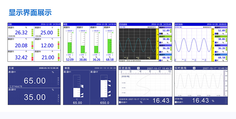 無紙記錄儀是將采集的數(shù)據(jù)/運(yùn)算數(shù)據(jù)以時(shí)間為基軸記錄在儀器內(nèi)部的存儲(chǔ)系統(tǒng)中,無消耗任何常用的記錄設(shè)施,如:紙張、筆墨。記錄在儀器內(nèi)部的存儲(chǔ)數(shù)據(jù),通過運(yùn)算、模擬后顯示在液晶屏。常用顯示用液晶屏比較廣泛。在液晶屏屏幕上,可以顯示數(shù)字顯示、棒圖顯示、曲線顯示、報(bào)警列表等。無紙記錄儀采集的數(shù)據(jù),常用的有:溫度、壓力、流量、液位、電壓、電流、濕度、頻率、振動(dòng)、轉(zhuǎn)速等。