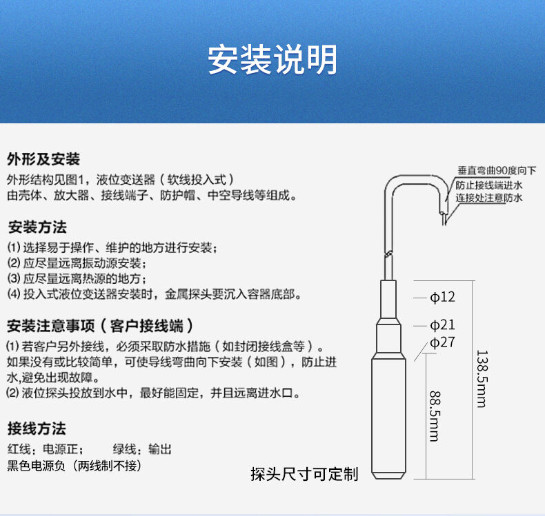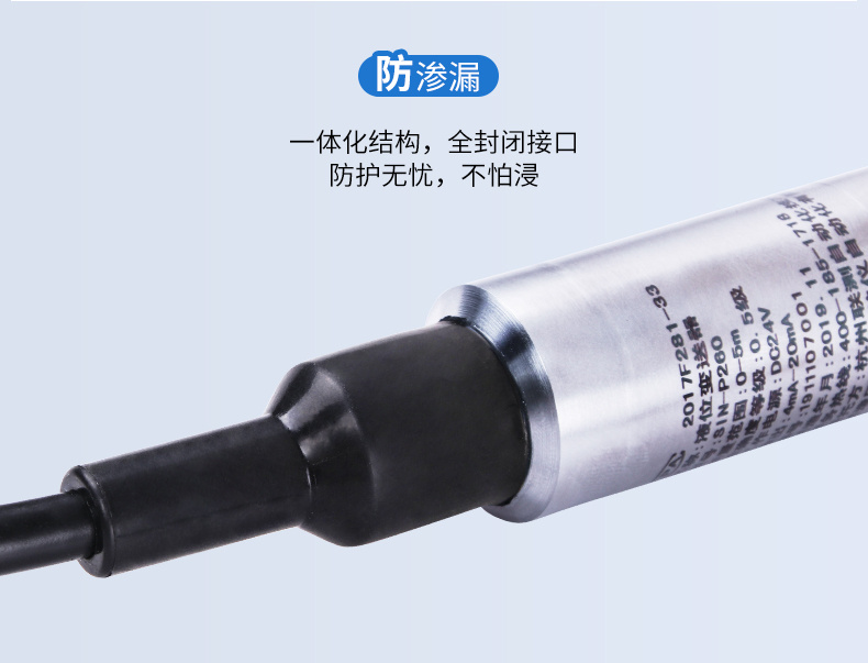 SIN-P260/P2600投入式液位變送器由高性能擴散硅壓阻式壓力傳感器作為測量元件,把與液位深度成正比的液體靜壓力準確測量出來,并經過信號調理電路轉換成標準(電流或電壓)信號輸出,建立起輸出信號與液體深度的線性對應關系,實現對液體深度的測量。