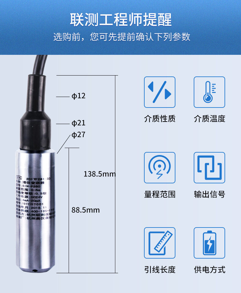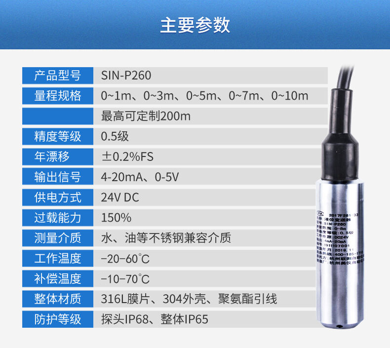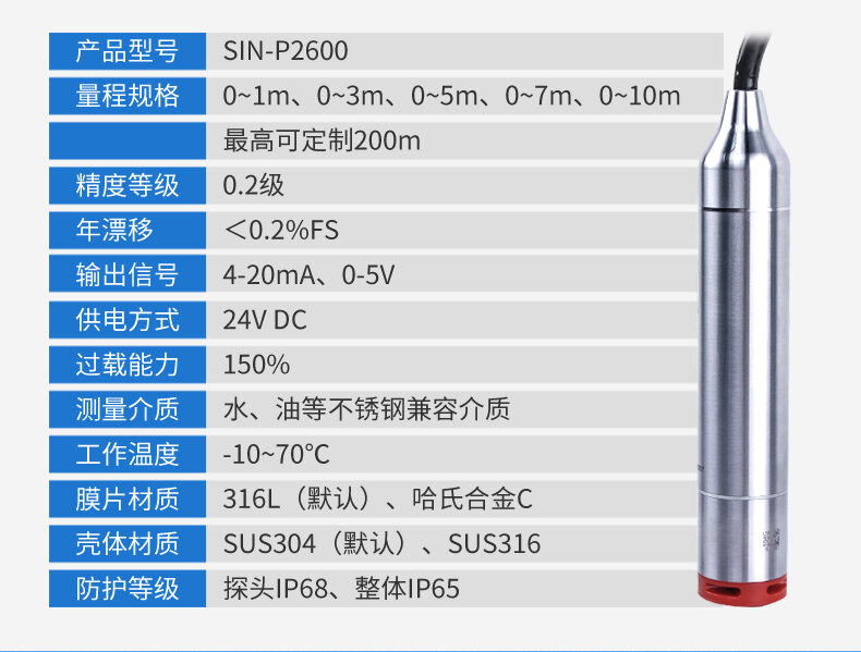 您的位置:首頁 > 液位變送器 → 聯測_SIN-P260投入式液位計/水位計_消防水箱_污水池_水庫液位_